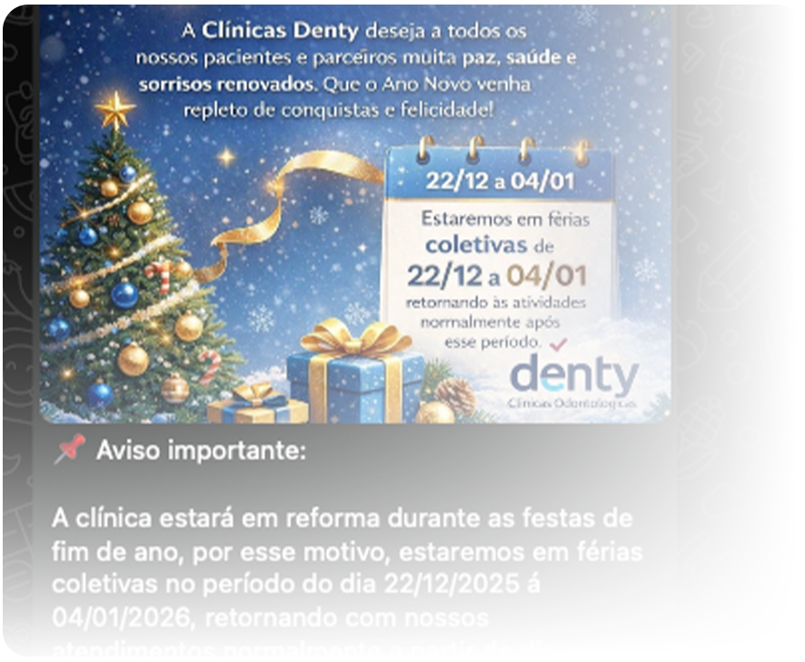Informe seus pacientes sobre novidades da clínica, mudanças de horário, novos serviços ou avisos importantes de forma rápida, clara e profissional pelo WhatsApp.