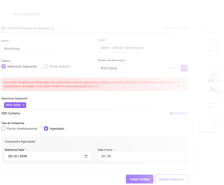 Crie campanhas de WhatsApp em poucos passos, definindo público, mensagem, agendamento e regras de envio com total controle.