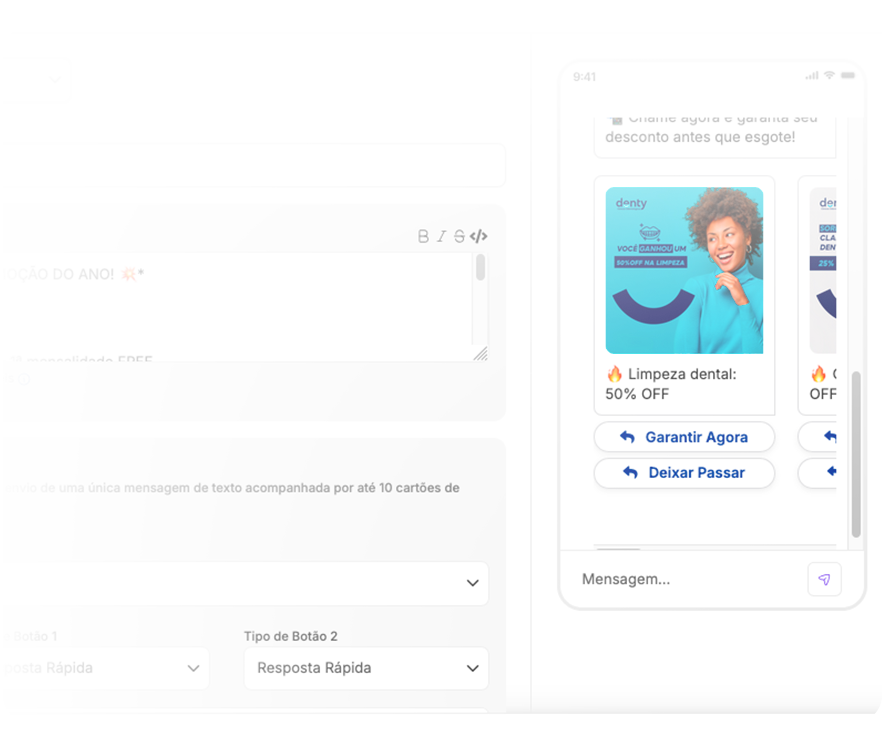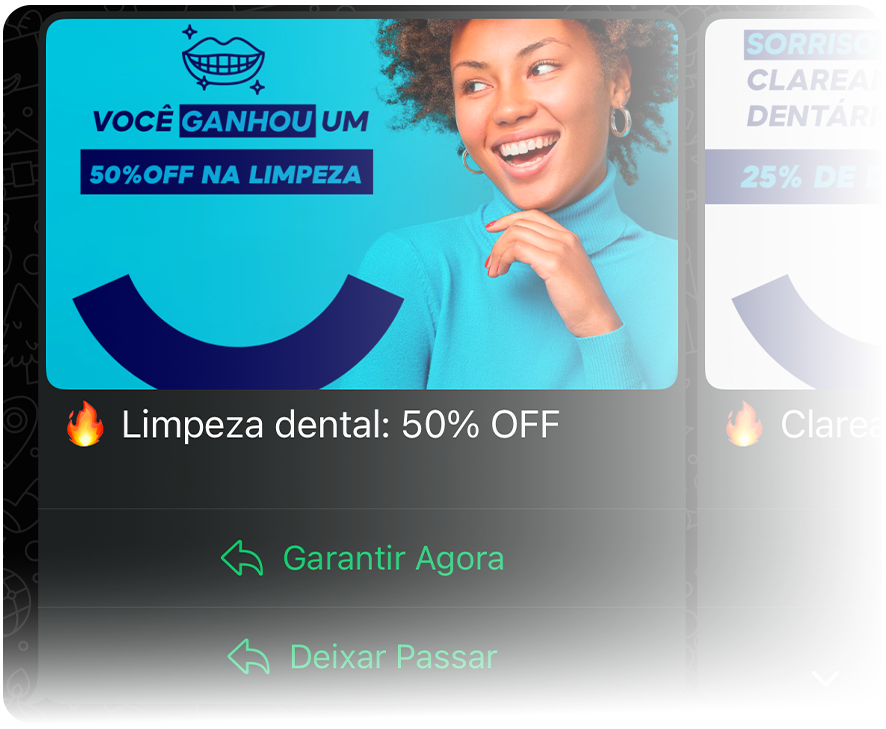 Envie mensagens promocionais para divulgar tratamentos, campanhas sazonais e condições especiais, alcançando pacientes no momento certo e aumentando a conversão em agendamentos.